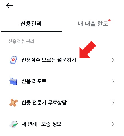 첫 번째 방법은 토스 앱에서 "신용점수 올리기" 서비스를 클릭하는 것입니다.
